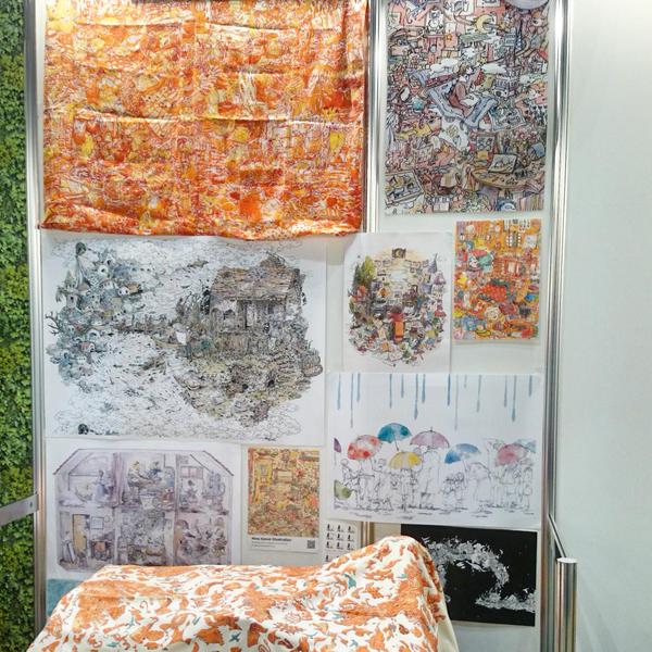 それと、あったかめの絵や、本の装画のようなイメージのもかざってたので出版社の方とか、チラシのクッションカバーの絵やそのほかがわりと派手だったからかわかりませんが、パッケージやCDのジャケットなどを手掛けている会社の方などともちょこちょこお話しました。